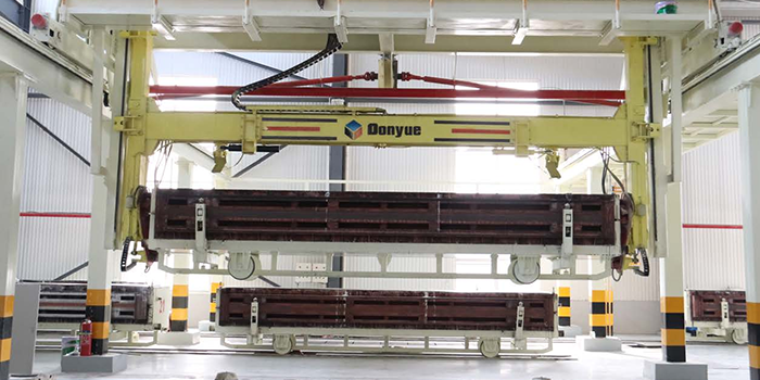 空翻脫模機用于抓取模箱翻轉(zhuǎn) 90°,側(cè)立在切割小車上進行切割;由行走部分與吊具組成,吊具升降、開鎖及翻轉(zhuǎn)均采用液壓驅(qū)動;模具開鎖采用液壓缸直開式結(jié)構(gòu),鎖緊臂旋轉(zhuǎn) 90°,具有開合迅速穩(wěn)定等特點;模具抓鉤采用直抓式結(jié)構(gòu),具有液壓鎖定及機械自鎖,確保吊運的安全。